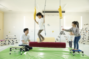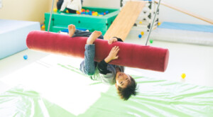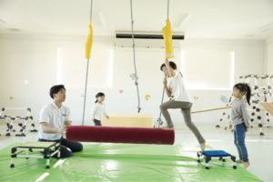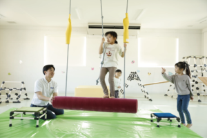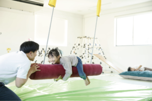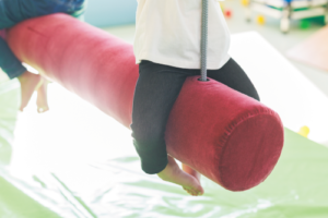 直径20cmの円柱形状で、未就学児でもしがみつきやすいサイズのスウィングです。両端をそれぞれ1本のロープで吊るすため、揺れや傾きがでやすく、自然と姿勢を保つ力を育むことができます。中身のクッション材に沈み込みの少ないものを採用することで、力が入りやすくしがみつきやすい仕様にしています。